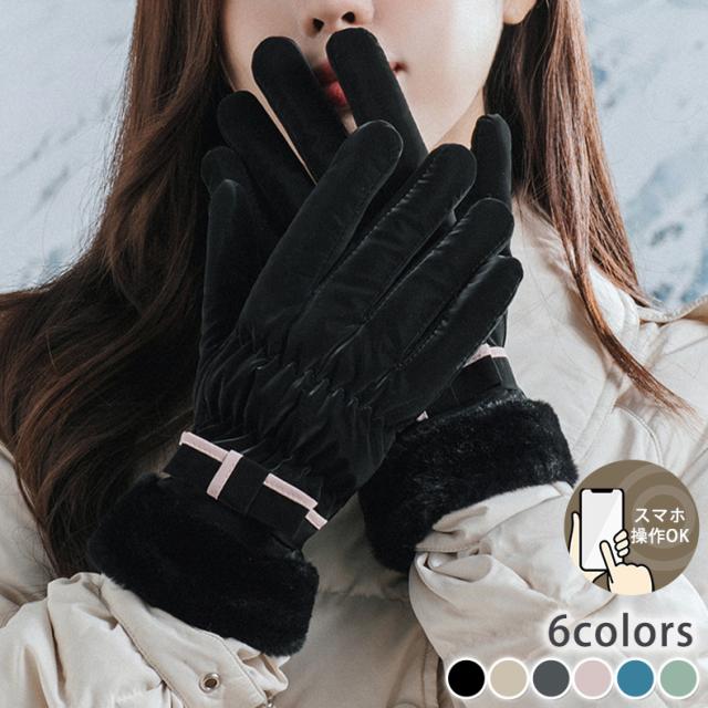 春新作 手袋 スマホ対応 レディース 冬 暖かい 撥水 裏起毛 防寒 保温 おしゃれ かわいい リボン ファー パイピング 黒 シンプル 五本指 普段使い 通勤 通学 スキー スノーボード レジャー スポーツ クロスカントリー 登山 トレッキング 自転車 バイク グローブ 雪かき 雪遊び