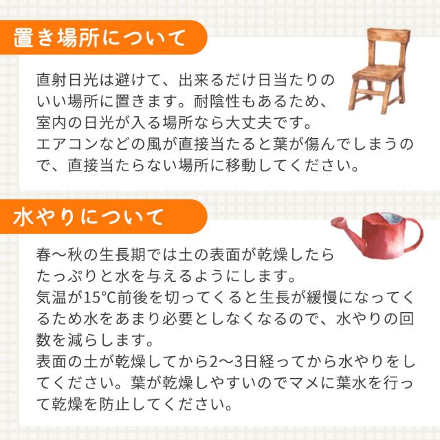| 直射日光は避けて、出来るだけ日当たりのいい場所に置きます。 耐陰性もあるため、室内の日光が入る場所なら大丈夫です。 エアコンなどの風が直接当たると葉が傷んでしまうので、直接当たらない場所に移動してください。 |