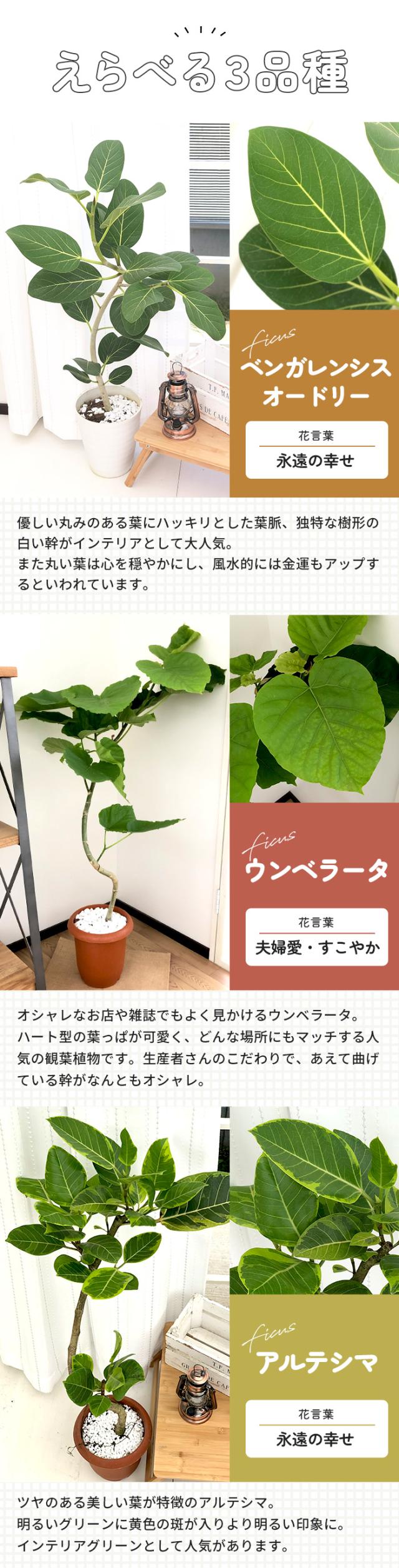 | 置くだけで癒される、観葉植物。 リビングのシンボルツリーに、玄関に置いて運気アップ、オフィスのインテリアに… 色々な置き方を楽しめます。 お好みの品種をみつけて育ててみましょう! 《科名》 クワ科 《属名》 フィカス属 3品種からお選びいただけます (1)ベンガレンシス オードリー 《学名》Ficus benghalensis 優しい丸みのある葉にハッキリとした葉脈、独特な樹形の白い幹がインテリアとして大人気。 また丸い葉は心を穏やかにし、風水的には金運もアップするといわれています。 (2)ウンベラータ 《学名》 Ficus umbellata オシャレなお店や雑誌でもよく見かけるウンベラータ。 ハート型の葉っぱが可愛く、どんな場所にもマッチする人気の観葉植物です。 (3)アルテシマ(アルテシーマ) 《学名》Ficus altissima ツヤのある美しい葉が特徴のアルテシマ。 明るいグリーンに黄色の斑が入りより明るい印象に。 インテリアグリーンとして人気があります。 |