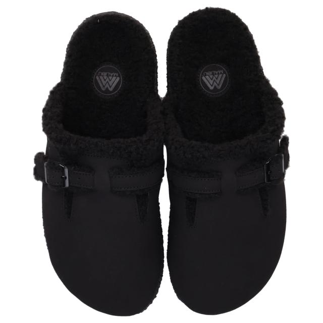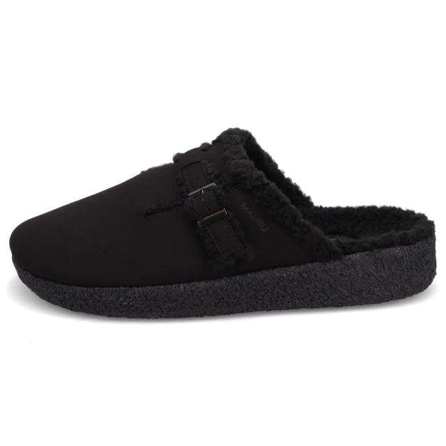 クロッグタイプのFLORES MULE(フローレス ミュール)。柔らかいスウェードヴィーガンレザー(合成マイクロファイバ)と、ライニングにはシェルパ素材を使用し、足へのフィット感と保温性を向上。アッパーのストラップでフィット感の調整が可能になっています。人間工学に基づいたアーチサポート、クッション性の高いEVAミッドソール、100%天然のクレープラバーをアウトソールに採用し、安定しているので履き心地がよく、丈夫で長く愛用できます。こちらは全体を黒でまとめたモノトーンカラー。