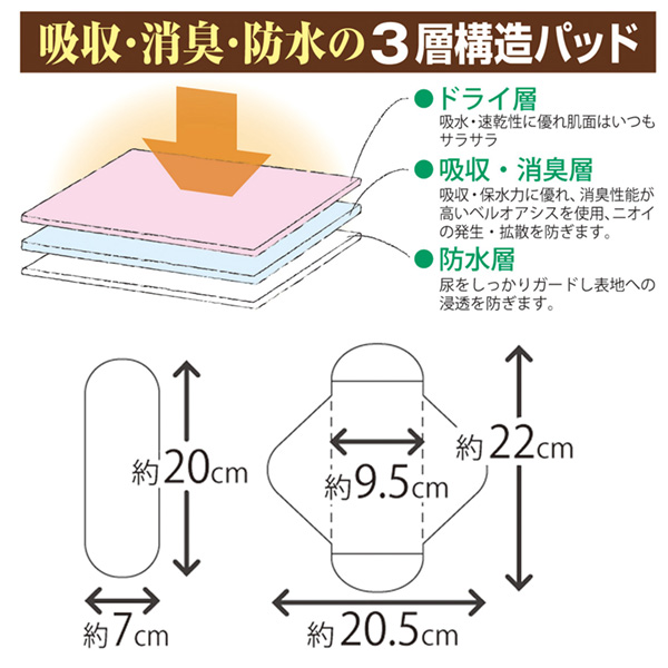 肌面はサラっとした着用感が快適な、東レのフィールドセンサーを使用、吸収・消臭・防水の3層構造パッドが尿を素早く吸収し、臭いの発生・拡散を防ぎます。