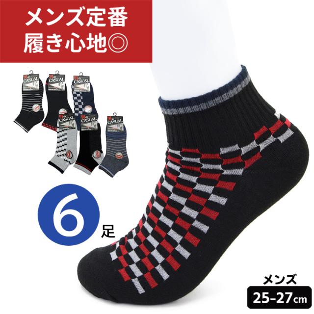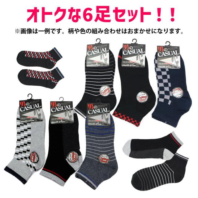 靴下 メンズ 綿混 丈長 柄 ショートソックス 6足組 25〜27cm 色柄おまかせ 紳士 男性 くるぶしソックス 爽やか 【メール便送料無料】 綿混素材 履き心地快適 カジュアル スニーカー ソックス オールシーズン アウトドア ウォーキング agesugi_sfa