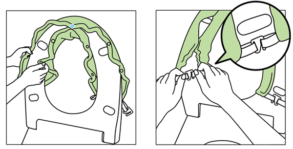 | 1、最初に真ん中ホックを便座の中央でとめ、他のホックをとめていきます。 | 2、プラスチックのフックを引っ張り、ゴムの輪に引っ掛けます。 |