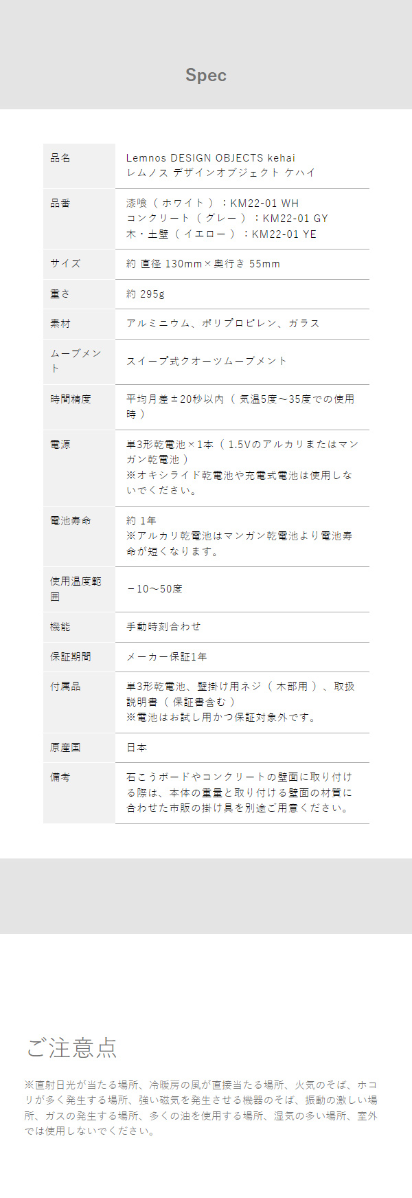 『 Lemnos ケハイ 』は、曖昧な時の気配を形にしたアートなウォールクロック。半透明のガラス越しにかすかに時刻を表示する、遊び心のあるデザインです。秒針の赤い点が文字盤をゆったりと回っていく様子は、まさに時間のオブジェそのもの。ムーブメントは音が静かな連続秒針タイプで、寝室やリラックスしたいスペースにもおすすめです。サニタリーなどの小さな空間にも適した、コンパクトな直径約13cmの掛け時計です。