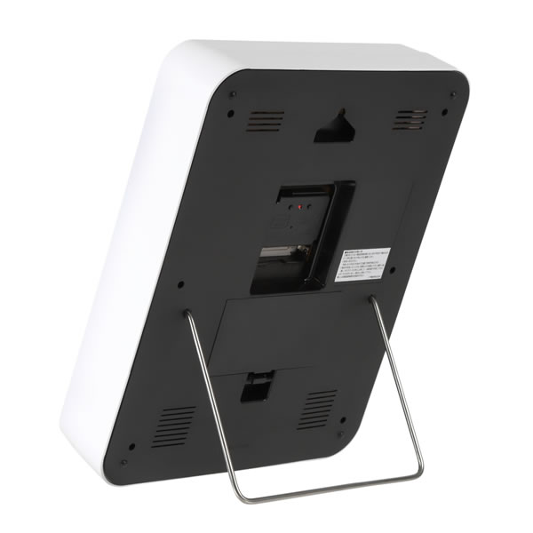夜光る!暗い場所でもライトが自動で点灯して時刻が見える掛時計 ・光の明暗をセンサーが感知して、周囲が暗くなるとライトが点灯します ・時刻を自動で修正する電波時計 ・しっかりと時を刻むステップ秒針 ・夜間は秒針が停止します ■本体サイズ:高さ316x横幅252x奥行58(mm) ■重さ:1200(g) ■電源:単3形乾電池x1個、単2形乾電池x4個 ■主な素材:プラスチック、ガラス ■原産国:中国 ■付属品:取扱説明書、保証書、スタンド ■機能:電波時計、ステップ秒針、温度表示(-19.9〜+50℃)、湿度表示(10〜95%RH)、夜間秒針停止機能(午後10時〜午前6時)、ライト自動点灯(光センサー式)、置掛両用 ※記載は商品仕様の一部です。仕様説明不足等の理由での返品はできません。特に適合等は必ずご確認ください。