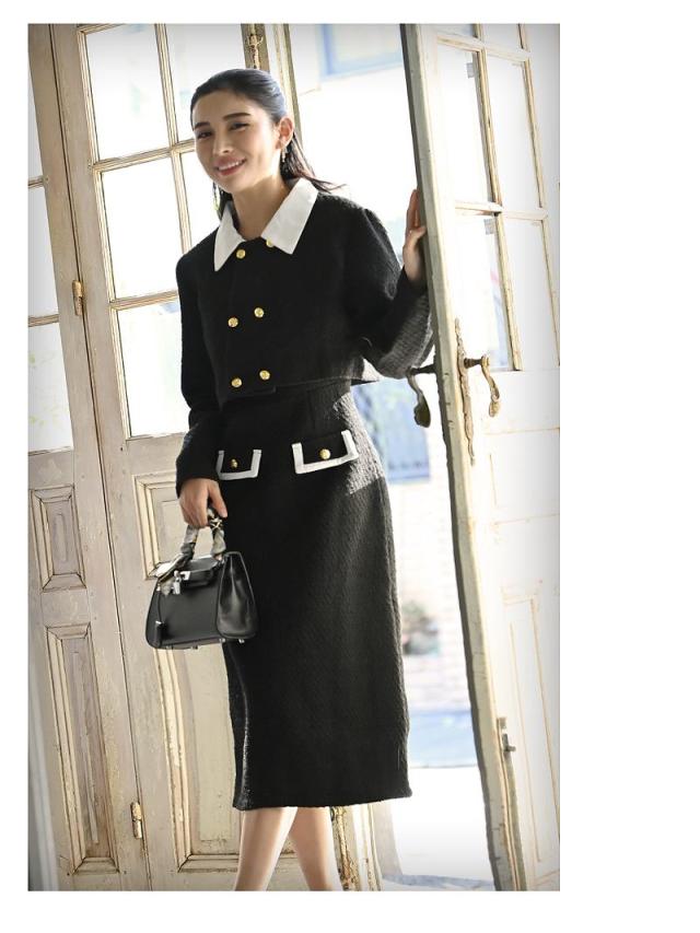 ☆体型カバー効果抜群のフレアワンピに丈が短めの襟付きジャケットを合わせることでくびれの位置を高く見せスタイル良く見せてくれます!またそれぞれにデザイン性を持たせたセットアップスーツは上下別でもお洒落な着こなしが楽しめます。