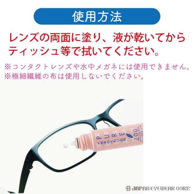 使用方法:レンズの両面に塗り、液が乾いてからティッシュ等で拭いてください。