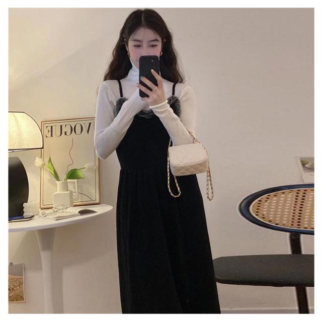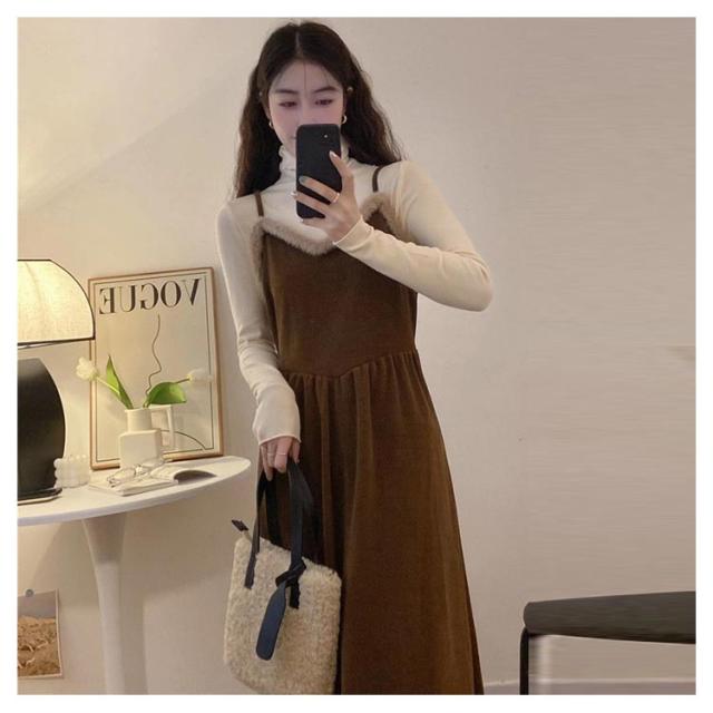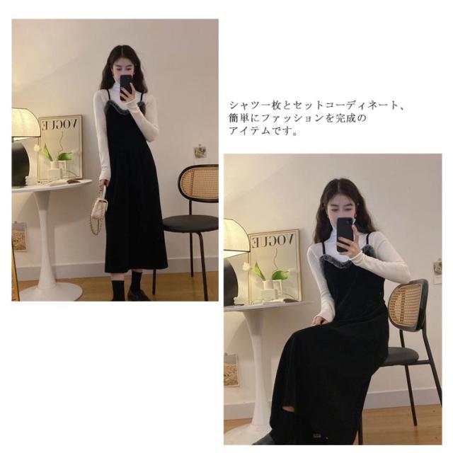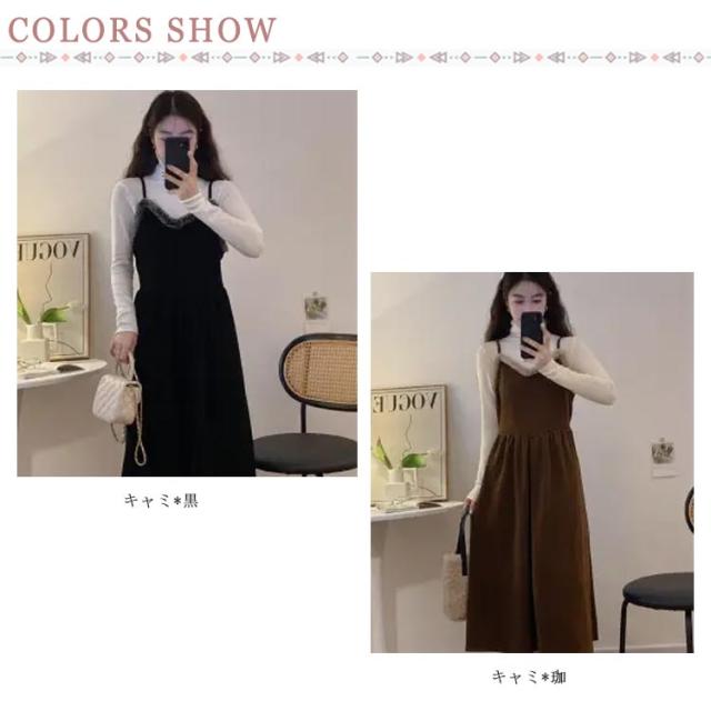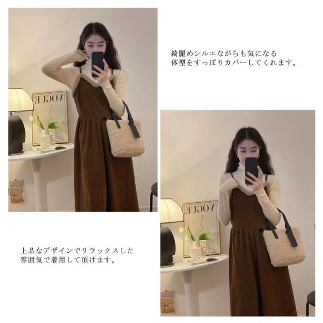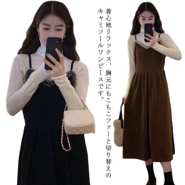 キャミワンピース キャミソールドレス ワンピース 秋冬 ロングワンピース ワンピ レディース Aライン 重ね着 着回し レイヤード きれいめ カジュアル ゆったり おしゃれ ファー付き S M L XL 2XL
