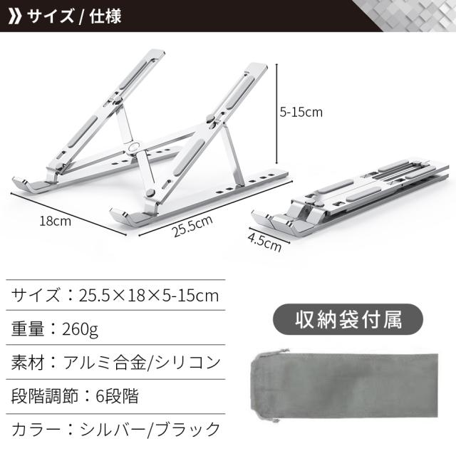 - 軽量で、6段階の調節も付いており、持ち運び便利な袋もあって、ノートパソコンを常に持ち運んで使っている私に取っては、とても重宝しております。
