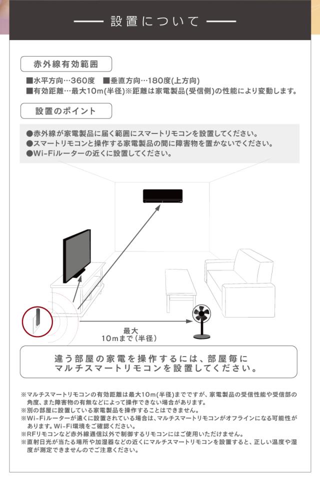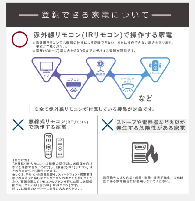| 備考 | ※赤外線リモコンでも機器の仕様により登録できない、または操作できない場合があります。予めご了承ください。 ※ストーブや電熱器など火災・感電・事故・傷害が発生する危険性がある家電製品には絶対に使用しないでください。 ※Wi-Fi環境、障害物、家電製品の状態などによりデバイスの確実な操作の保証はできかねます。また、遠隔操作に関しては、家電製品の動作を直接確認できないため、安全面を確保の上ご使用ください。誤作動や操作不能などにより発生した人身事故、ペットの事故、火災事故およびそれによって生じた損害に関して当社はいかなる責任も負いかねます。 ※スマートリモコンの有効距離は最大10m(半径)までですが、家電製品の受信性能や受信部の角度、また障害物の有無などによって操作できない場合があります。 ※別の部屋に設置している家電製品を操作することはできません。 |