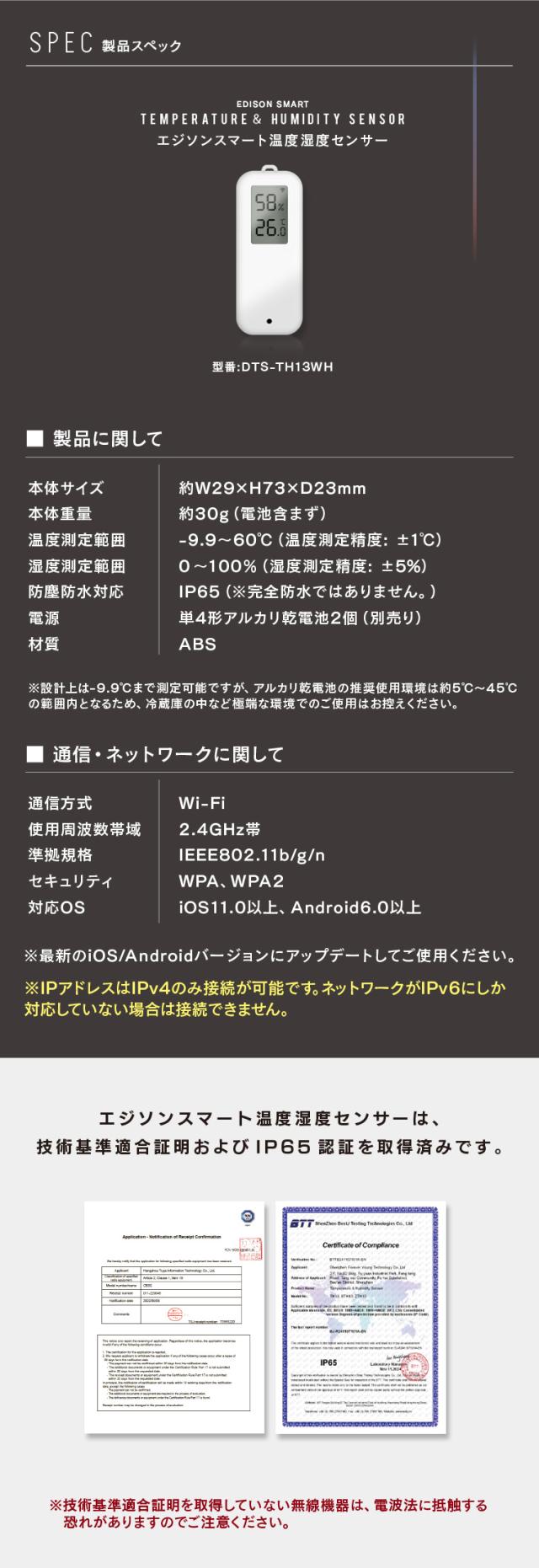 | 仕様 | ■環境・電源 ・電源:単4形アルカリ乾電池2個(別売) ・温度測定範囲: -9.9〜60℃(温度測定精度: ±1℃) ・湿度測定範囲:0〜100%(湿度測定精度: ±5%) ・防塵防水対応:IP65(※完全防水ではありません。) ・材質:ABS ■通信・ネットワーク ・通信方法:Wi-Fi ・使用周波数帯域:2.4GHz帯(5GHz帯では接続できません) ・準拠規格:IEEE 802.11b/g/n ・暗号化形式:WPA/WPA2 ・対応OS:iOS11.0以上/Android6.0以上 ・スマートスピーカー:Amazon Echo(Amazon Alexa)/Google Home(Google Assistant)対応 ・メーカー保証期間:1年間 ※IPv4にのみ対応(ネットワーク環境やWi-FiルーターがIPv6にしか対応していない場合はデバイス登録ができません。) 本製品は、国内電波法に基づく特定無線設備の技術基準適合証明などを受けた製品です。 |