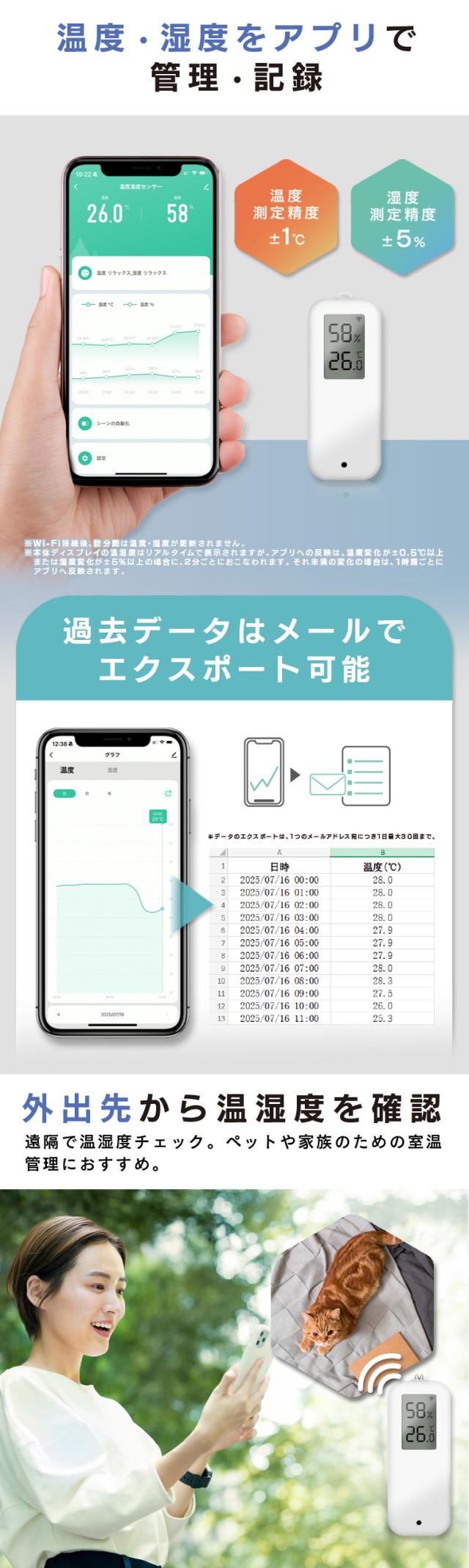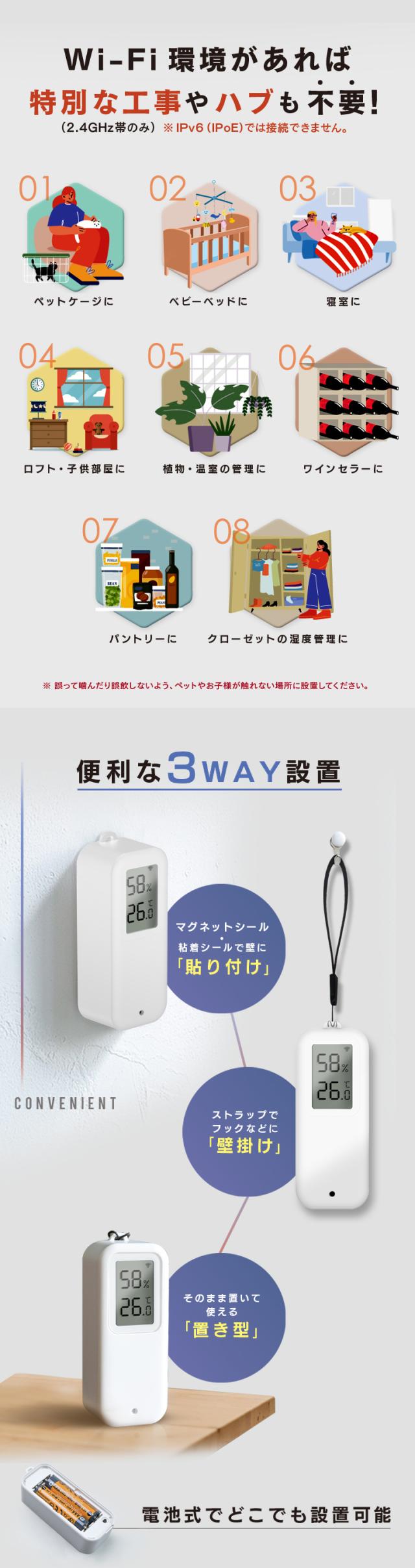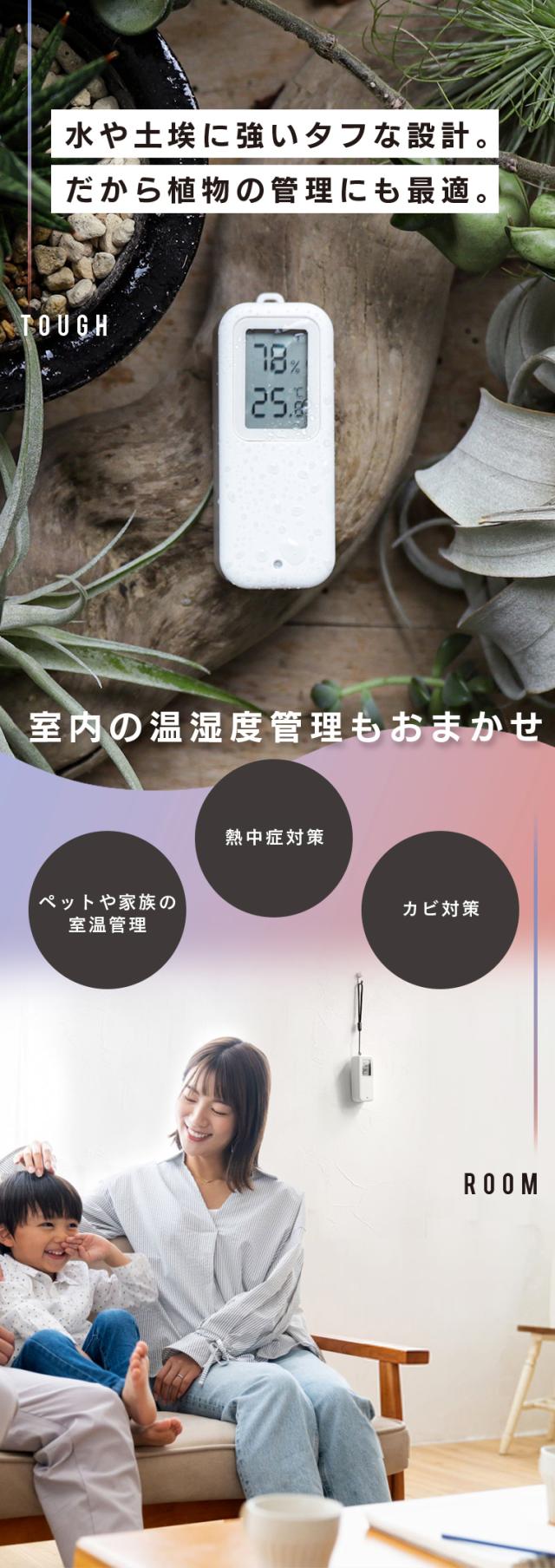 遠隔チェック:外出先からスマホで温度・湿度を確認。ペット/家族/植物の見守りに最適。