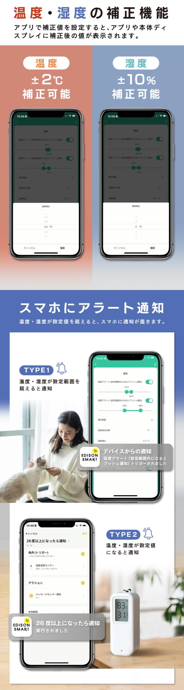 温度・湿度の補正機能:温度±2℃・湿度±10%まで補正可能。