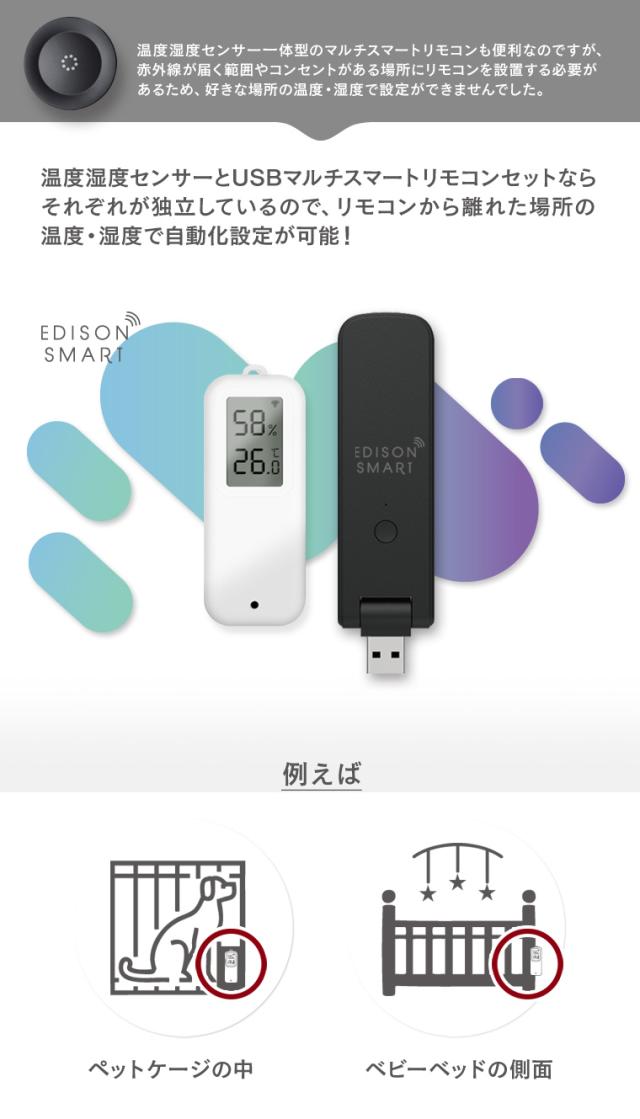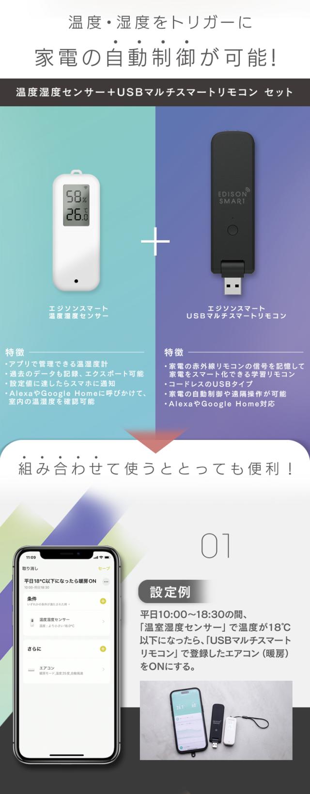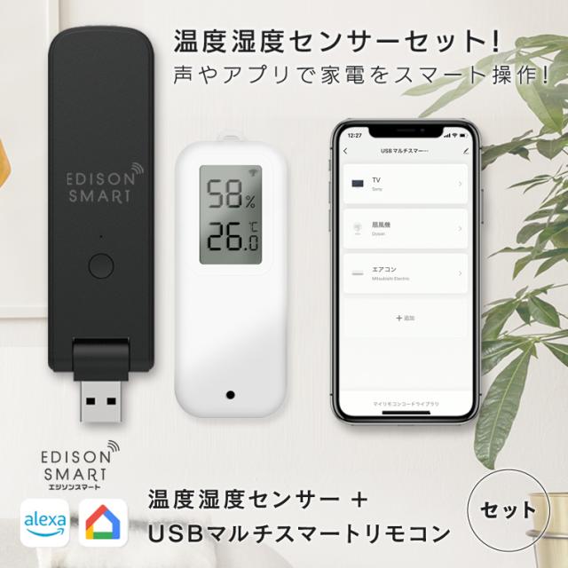【セット】エジソンスマート 温度湿度センサー + USBマルチスマートリモコン セット 学習リモコン スマートリモコン 温度計 湿度計付き アプリ スマホ 家電を遠隔操作 自動化 タイマー機能 赤外線リモコンを一つに 音声操作 電池式 スマート家電