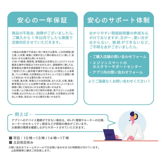 | 仕様 | 【温度湿度センサー】 ■環境・電源 ・電源:単4形アルカリ乾電池2個(別売) ・温度測定範囲:-9.9〜60℃(温度測定精度: ±1℃) ・湿度測定範囲:0〜100%(湿度測定精度: ±5%) ・防塵防水対応:IP65(※完全防水ではありません。) 【USBマルチスマートリモコン】 ・入力:USB DC5V/1A ・赤外線:到達距離約10m(半径)※設置環境による ・赤外線周波数:38kHz ・動作環境:温度0〜50℃、湿度85%以下 ■通信・ネットワーク ・通信方法:Wi-Fi ・使用周波数帯域:2.4GHz帯(5GHz帯では接続できません) ・準拠規格:IEEE 802.11b/g/n ・暗号化形式:WPA/WPA2 ・対応OS:iOS11.0以上/Android6.0以上 ・スマートスピーカー:Amazon Echo(Amazon Alexa)、Google Home ・メーカー保証期間:1年間 ※IPv4にのみ対応(ネットワーク環境やWi-FiルーターがIPv6にしか対応していない場合はデバイス登録ができません。) 本製品は、国内電波法に基づく特定無線設備の技術基準適合証明などを受けた製品です。 |