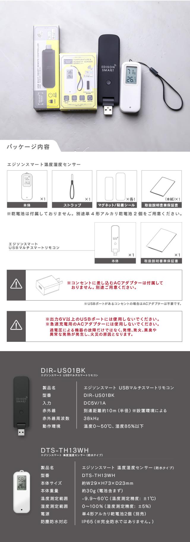 | 商品名 | エジソンスマート 温度湿度センサー(防水タイプ) + USBマルチスマートリモコン セット EDISON SMART TEMPERATURE & HUMIDITY SENSOR IP65 + USB MULTI SMART REMOTE CONTROLLER SET |