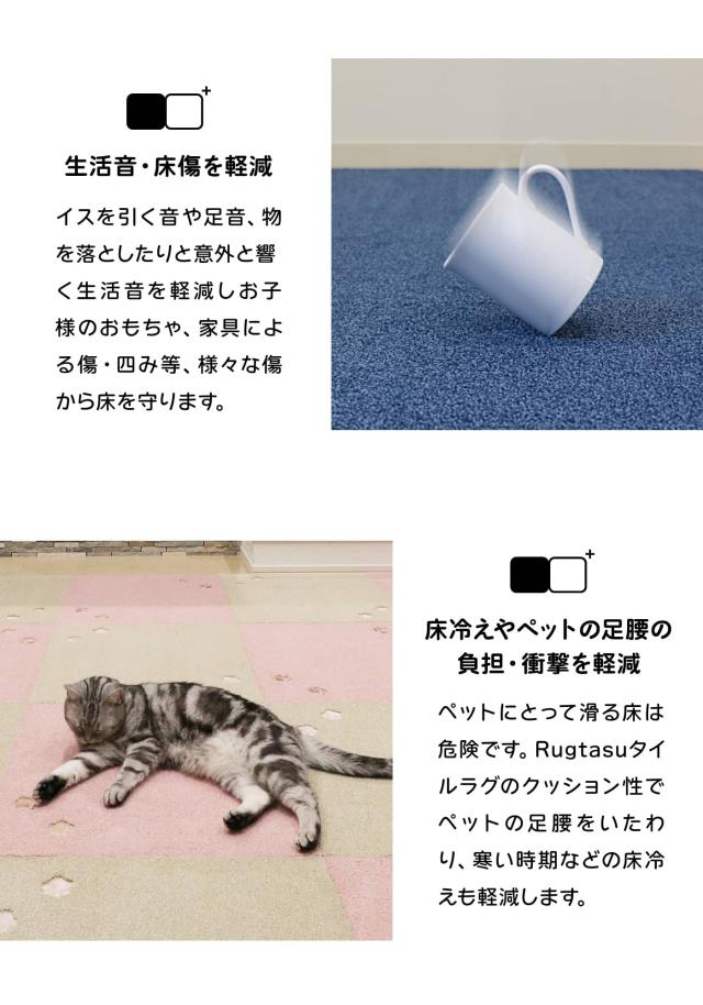 【メーカー直送】組み合わせやサイズも自由自在!敷いて楽しいRugtasuタイルラグ。ロボット掃除機に対応、ズレやめくれにくくスムーズなお手入れ。洗濯機丸洗いOK。