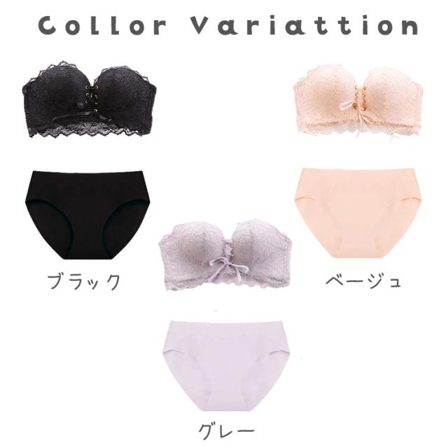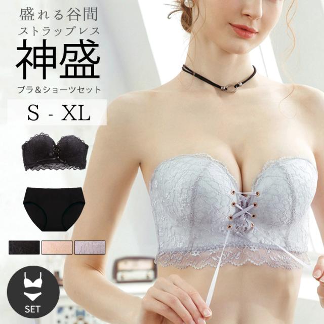 ストラップレスブラ ショーツ セット 落ちない 盛れる 肩紐なし チューブトップ ストラップレス ブラ ずれない 肩紐なし ブラジャー 紐なしブラ ヌーブラ 結婚式 ノンワイヤー シームレス レース リボン 肩だし 可愛い