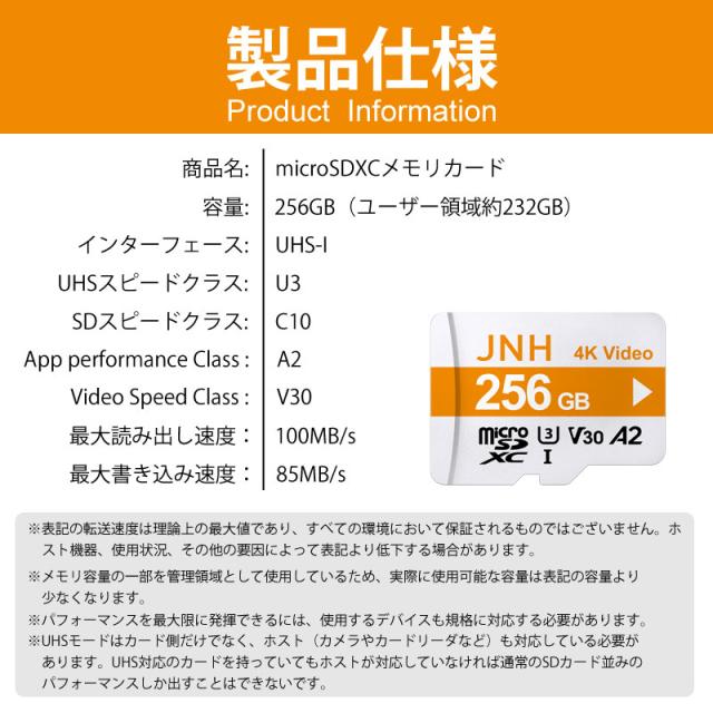 microSDXC 256GB JNHブランド 超高速 R:100MB/S W:85MB/S Class10 UHS-I U3 V30 4K Ultra HD A2対応 5年保証 Nintendo Switch/DJI OSMO/GoPro動作確認済 microSDカード MicroSD sdカード メモリーカード マイクロSDカード ポイント消化