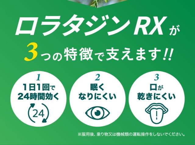 ロラタジンRXは眠くなりにくく、口のかわきも少ない第2世代抗ヒスタミン成分「ロラタジン」のアレルギー専用鼻炎薬です。1日1回1錠で、花粉やハウスダストなどによる鼻みず、鼻づまり、くしゃみの症状に効き目が長持ちします。