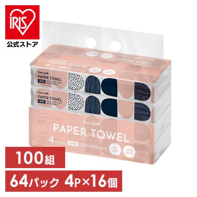 【64個】パルプペーパータオル100組中判4P×16 ペーパータオル 紙タオル レギュラーサイズ 中判 100組 200枚 ピュアパルプ 手拭きペーパー スマートエール 2枚組