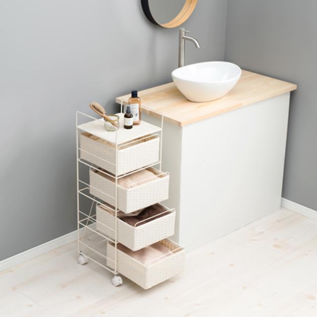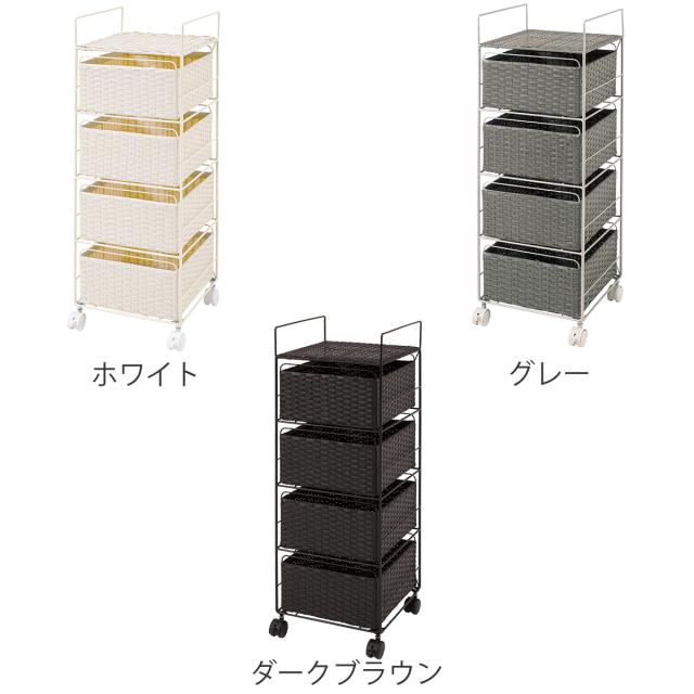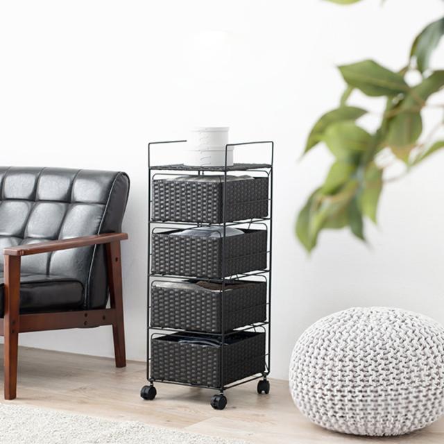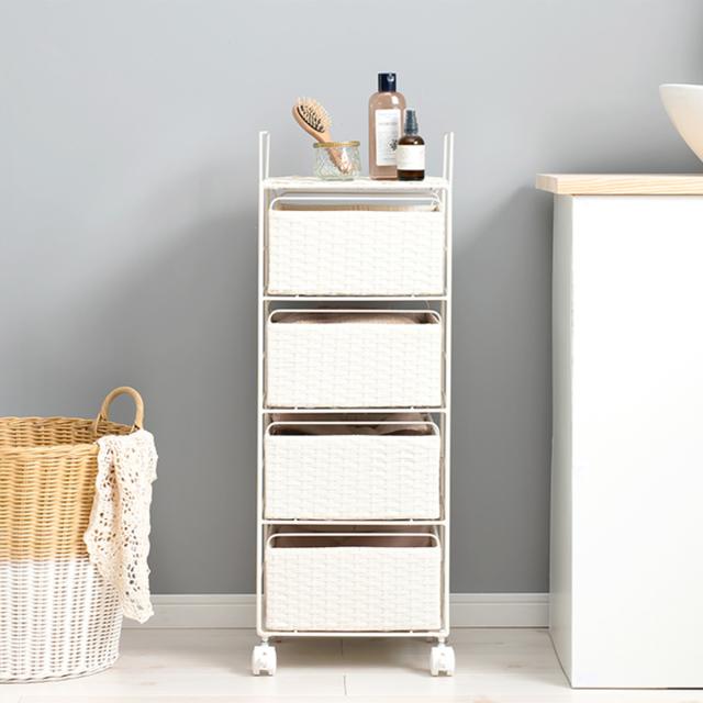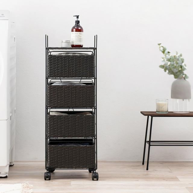 キャスター付きで移動のしやすいラタン調のランドリーチェストです。4段の引出しには、かさばりやすい衣類やタオルなどをしっかりと収納することができます。お手入れのしやすい樹脂製なので、水周りでも便利にお使いいただけます。