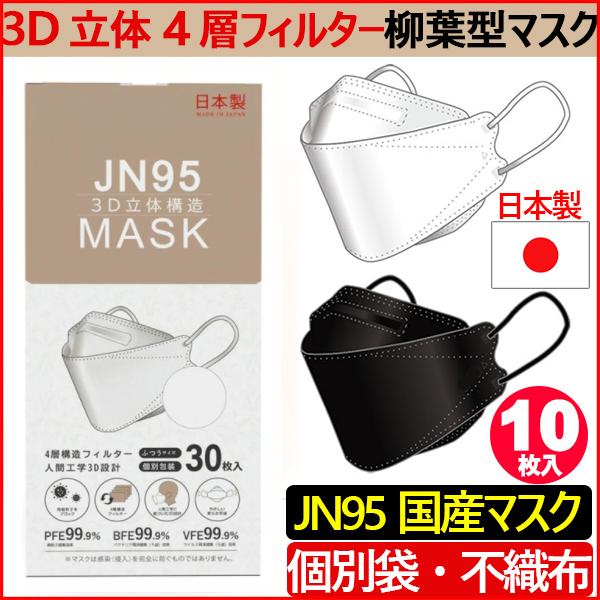 (国内生産品) 日本製 マスク 不織布 使い捨て 個別包装 高性能マスク 10枚入り 立体構造 4層 3D JN95 柳葉型マスク 医療関係も使用 PM2.5 kf94 N95 花粉症