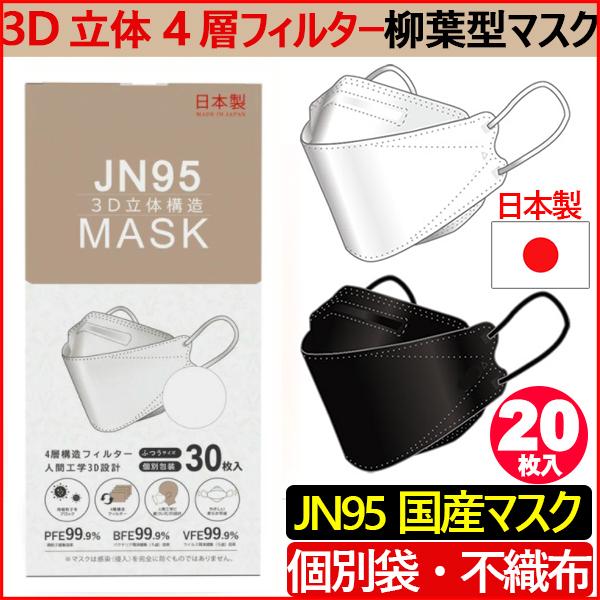 (国内生産品) 日本製 マスク 不織布 使い捨て 個別包装 高性能マスク 20枚入り 立体構造 4層 3D JN95 柳葉型マスク 医療関係も使用 PM2.5 kf94 N95 花粉症