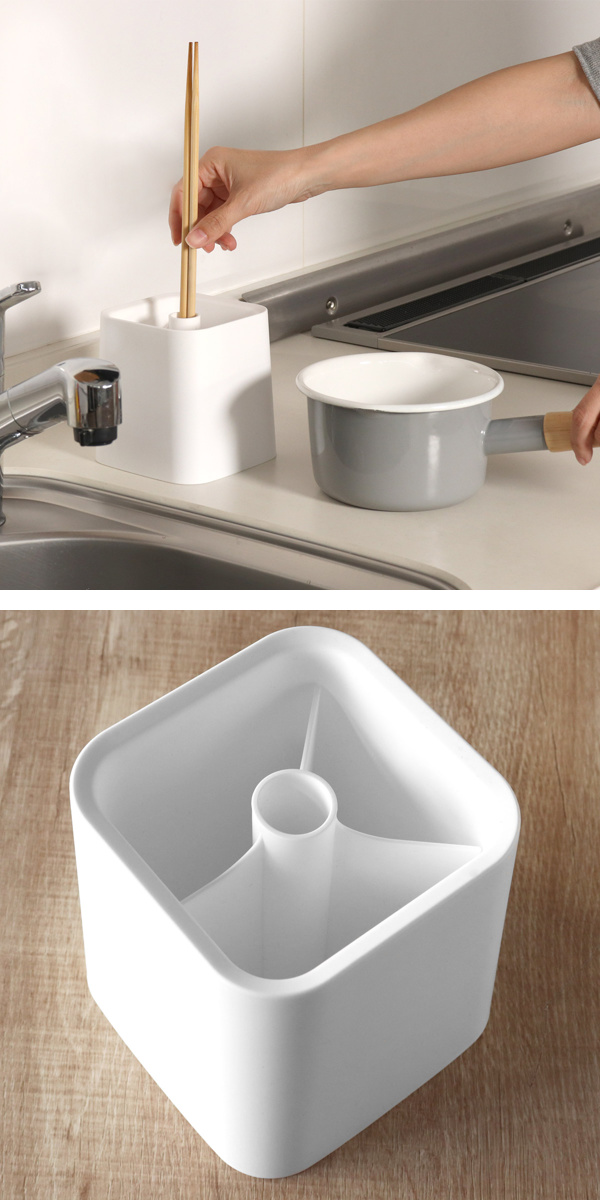 3つのスペースに分けられる仕切りが付いています。使用用途に合わせて仕分けをしながら収納できるので便利です。また、中央には菜箸を立てて収納することができます。サッと取り出したいときもツールの中に埋もれることなく取り出せます。