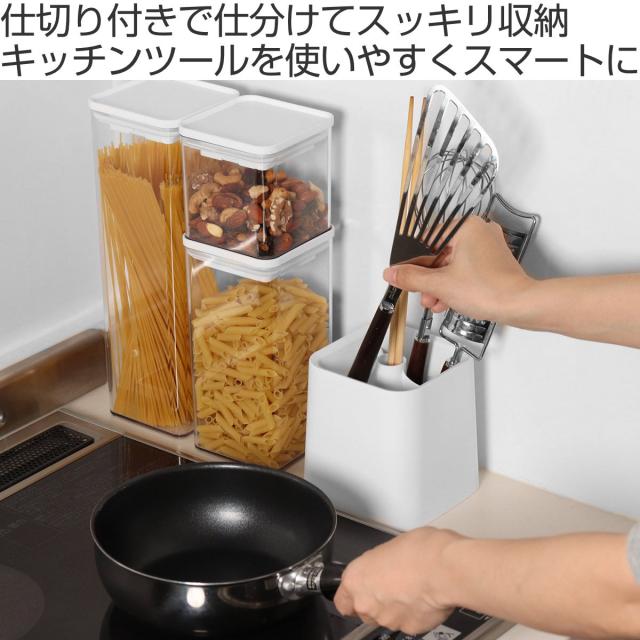 お玉などのツールを立てて収納し、調理中にサッと取り出せるキッチンツールスタンドです。ごちゃついてしまうキッチンツールをスッキリとスマートに収納することができます。取り外せる仕切り付きで仕分けしながら収納できるのも嬉しいポイントです。