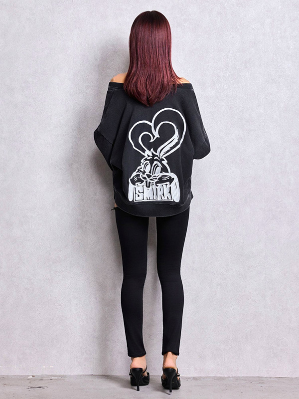 GYDA V-neck SMIRK BUNNY sweatshirt ジェイダ Vネック SMIRK BUNNY スウェット トップス 【GYDA(ジェイダ)】 西海岸LAのちょっとエッジィなスタイリング、空気感をイメージ。 オンナらしい体のラインは露出しつつ、下品にならないアイテム。 ミニマルなアイテムをシルエットや色でスタイリングして、エッジィさを出すLAのギャルのように、 セクシーだけどカジュアルな女の子のためのスタイリングを提案します。 バックに、大人気キャラクター”BUNNY”のアートが施され、 ヴィンテージライクな色落ち感がこなれ感をプラス。 デコルテをすっきり見せてくれるVネックディテールに仕上げました。 | ||||||||||