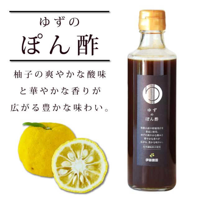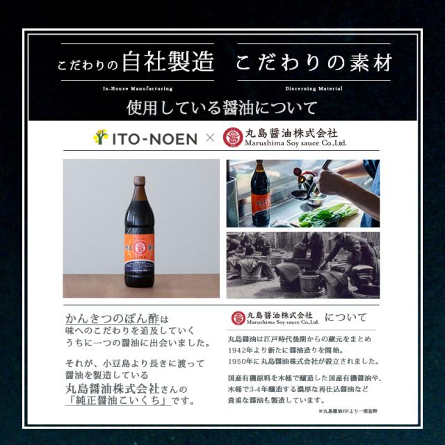 香川県小豆島のしょうゆメーカー、丸島醤油の無添加醤油を使用し、伊藤農園のオリジナル果汁をベースに作ったこだわりのぽん酢です。