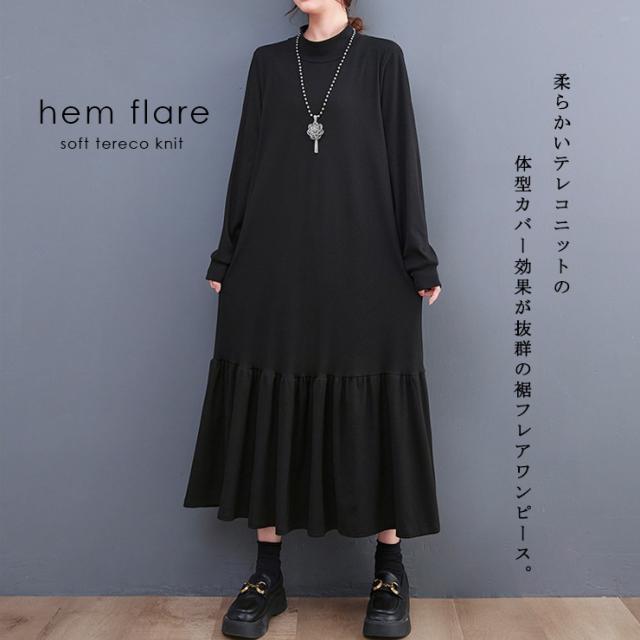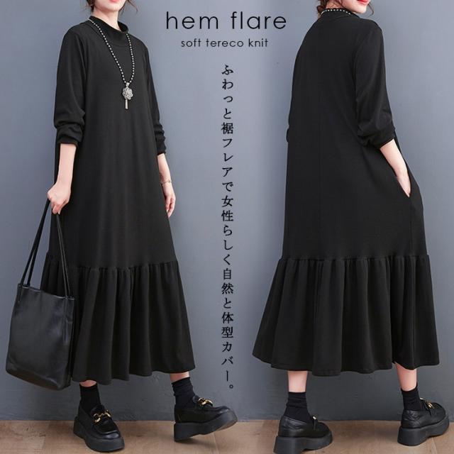 大きいサイズ レディース 裾フレアワンピース 黒 オーバーサイズ オフネック ロング丈 春 秋 冬 (566535)