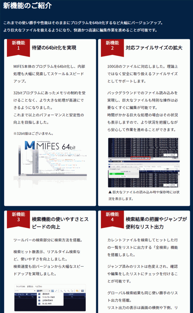 プロフェッショナルエディタ「MIFES」の最新バージョン(パッケージ商品)です。本体プログラムが64bit化され、Windows 11 に対応。100GBのファイルを安全に編集が可能。また、検索エンジンを刷新しさらなる高速化を実現しています。Gitクライアント機能や新しいファイル比較を搭載。検索、CSV、HTML編集などでさらに使いやすさと機能の向上を行いました。