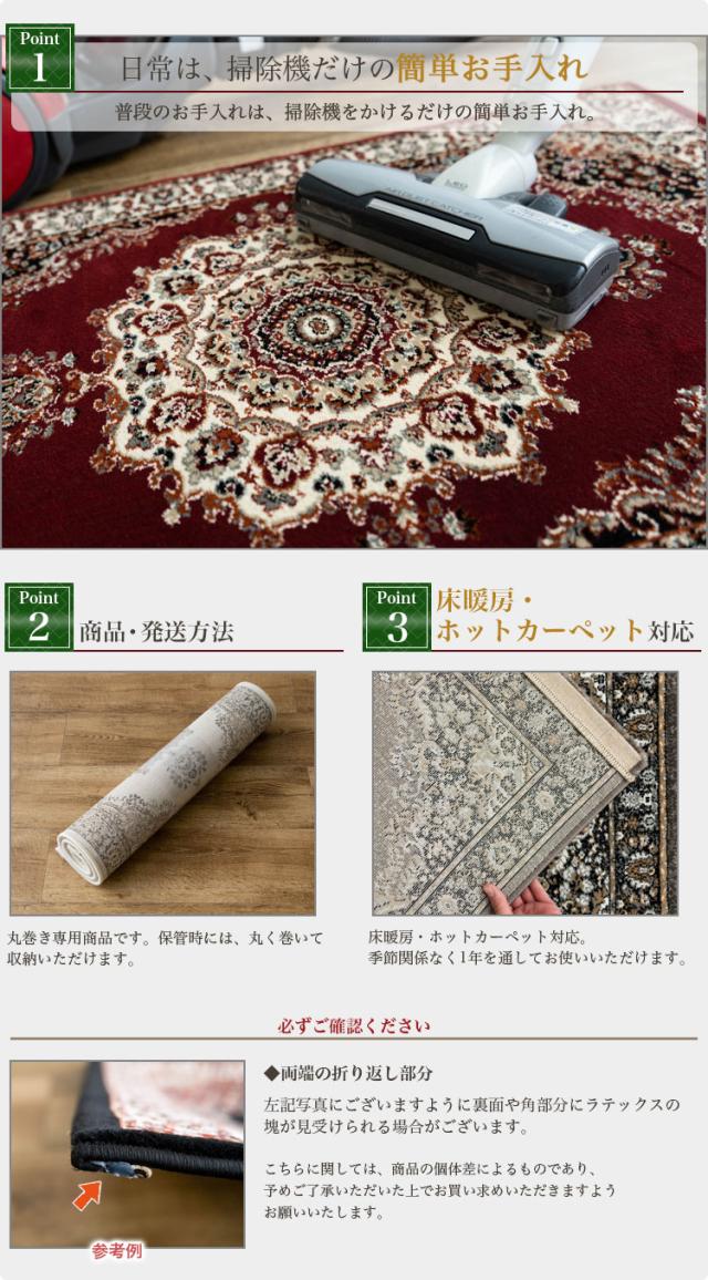 | 【お届け時】 ・丸巻き ※商品は開梱時、ラグマット、カーペットの毛並みにムラなどがございますが、使用するにつれ、なくなります。 ※商品によりサイズに多少の誤差があります。 ※カラーはディスプレイ上、実際の色と多少異なる場合がございます。 ※ウィルトン織りの製法により、使用され、裏面に塗られる仕上げの接着塗料は、ご使用当初、常温のもとで気化( 蒸発 )する、揮発性の匂いがございます。 ※こちらの商品は気になる遊び毛などは出にくいつくりとなっております。 ※滑りやすい場所でのご使用は市販のカーペット用の滑り止めネットのご使用をお勧めします。 ※汚れた場合は、カーペットクリーナー、中性洗剤などを薄め固く絞ったタオルなどで拭き取ってください。 | |