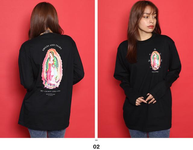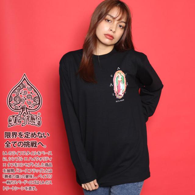 【59%OFF】ACEFLAG ロンT レディース 黒 白 大きいサイズ エースフラッグ Tシャツ 長袖 聖母 マリア 聖母マリア マリア像 ブランドロゴ チカーノ ローライダー ファッション ダンス ストリート系 ブランド 服 AF-TL-LT-020