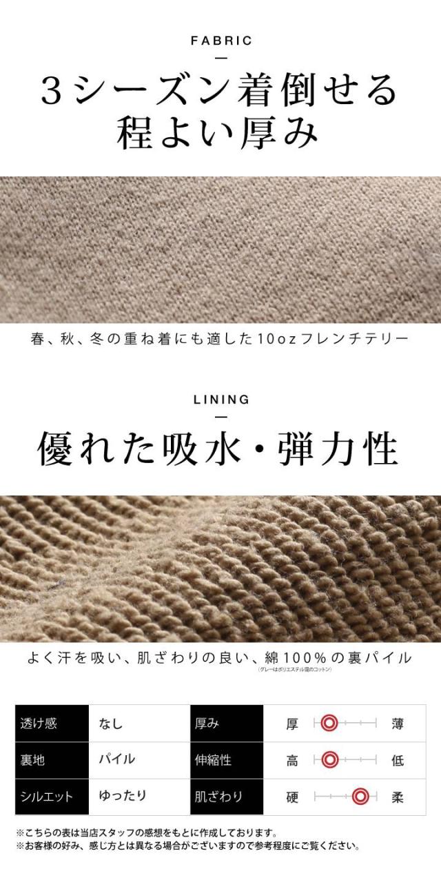 毎日着たくなる心地よさと高いデザイン性を兼備したアメリカンスウェットの王道ともいわれるヘビーブレンド生地。コットン100%なので、毛玉ができにくく、吸汗性に優れソフトな肌触りが実感できます。1枚でもシルエットがビシッとキマる程よい厚みも人気の理由です。