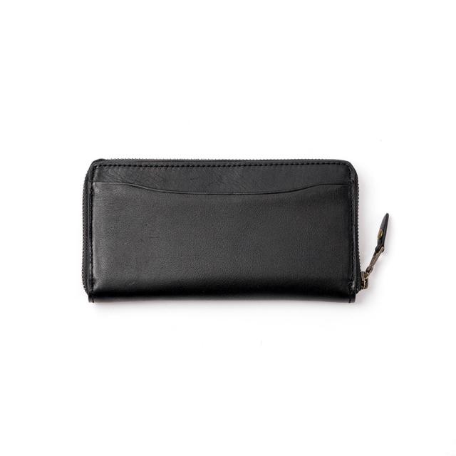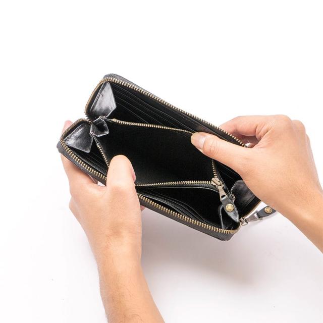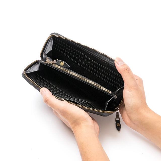 比較的スリムなラウンドファスナー型の長財布。カードポケットは12個、札入れは2か所。財布の背面にもポケットを装備しており、領収書やレシートを入れるのに便利です。