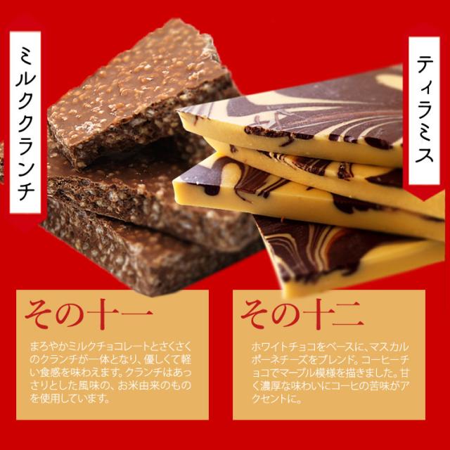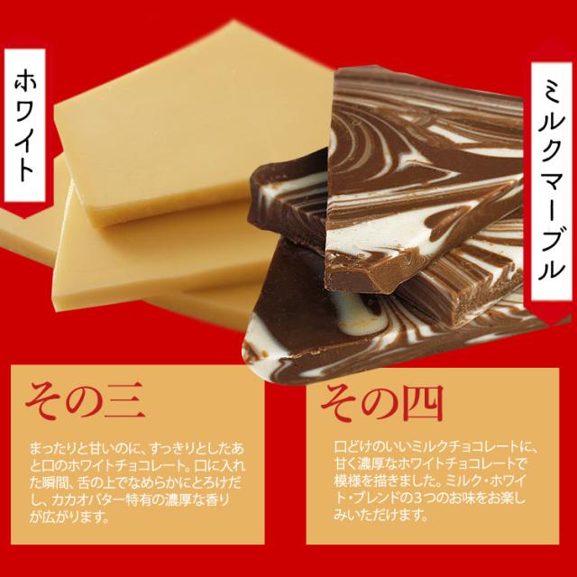 | 原材料 | 【ミルク】ココアバター(外国製造)、砂糖、乳糖、全粉乳、カカオマス/乳化剤、香料【ミルクアーモンド】砂糖(外国製造)、ココアバター、乳糖、全粉乳、アーモンド、カカオマス/乳化剤、香料【ミルクマーブル】砂糖(外国製造)、ココアバター、全粉乳、脱脂粉乳、カカオマス、乳糖、ホエイパウダー、無水乳脂肪、デキストリン/乳化剤、香料【ミルククランチ】砂糖(外国製造)、ココアバター、乳糖、全粉乳、ライスパフ、カカオマス/乳化剤、香料【まるごとアーモンドパフ】砂糖(外国製造)、ココアバター、アーモンド加工品、乳糖、全粉乳、カカオマス、ライスパフ/乳化剤、香料【ミルクカシューナッツ】砂糖(外国製造)、ココアバター、カシューナッツ、乳糖、全粉乳、カカオマス、/乳化剤、香料【ミルクワッフル】砂糖(外国製造)、ココアバター、乳糖、小麦粉、全粉乳、ココアパウダー、植物油脂、食塩/乳化剤、香料、着色料(カラメル、アナトー)【ミルククリスピーキャラメル】砂糖(外国製造)、ココアバター、乳糖、キャラメルフレーク(砂糖、グルコースシロップ、還元乳、その他)、全粉乳、カカオマス/乳化剤、香料【ミルクラムレーズン】砂糖(外国製造)、ココアバター、乳糖、レーズン、全粉乳、カカオマス、粉末酒/乳化剤、香料【ビター】カカオマス(外国製造)、砂糖、ココアバター/乳化剤、香料【ビターマーブル】ココアバター(外国製造)、砂糖、全粉乳、ココアパウダー、カカオマス、乳糖、ホエイパウダー、無水乳脂肪、デキストリン/乳化剤、香料【ビタークランチ】ココアバター(外国製造)、砂糖、乳糖、ライスパフ、ココアパウダー、カカオマス/乳化剤、香料【ビターオレンジピール】ココアバター(外国製造)、オレンジピール、砂糖、乳糖、ココアパウダー、カカオマス/乳化剤、酸味料、香料、保存料(亜硫酸塩)【ビターストロベリーマーブル】ココアバター(外国製造)、砂糖、全粉乳、ココアパウダー、カカオマス、脱脂粉乳/乳化剤、着色料(ビートレッド)、香料、酸味料【ビターワッフル】ココアバター(外国製造)、砂糖、乳糖、小麦粉、ココアパウダー、カカオマス、植物油脂、食塩/乳化剤、香料、着色料(カラメル、アナトー)【ホワイト】砂糖(外国製造)、ココアバター、脱脂粉乳、ホエイパウダー、無水乳脂肪、デキストリン/乳化剤、香料【ホワイトつぶイチゴ】砂糖、ココアバター、ドライイチゴ、脱脂粉乳、ホエイパウダー、無水乳脂肪、デキストリン/乳化剤、酸味料、着色料(赤色40号)、香料、保存料(メタ重亜硫酸ナトリウム)【つぶつぶイチゴ】砂糖(外国製造)、ココアバター、脱脂粉乳、全粉乳、いちご/着色料(ビートレッド、赤色40号)、乳化剤、酸味料、香料、保存料【抹茶マーブル】砂糖(外国製造)、ココアバター、乳糖、ホエイパウダー、無水乳脂肪、抹茶パウダー、デキストリン/乳化剤、香料【ティラミス】砂糖(外国製造)、ココアバター、脱脂粉乳、マスカルポーネチーズパウダー、バターオイル、ホエイパウダー、乳糖、カカオマス、デキストリン、ココアパウダー、コーヒー粉末、/乳化剤、香料、着色料(クチナシ色素)、(一部に乳成分、小麦粉、アーモンド、大豆、カシューナッツ、オレンジを含む) |
