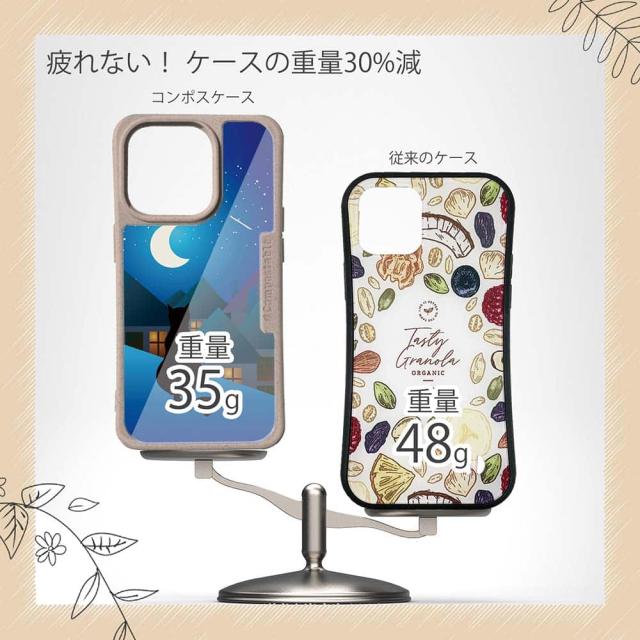 | 注意事項 | コンポスケースは、フレーム部分に「生分解性プラスチック」という環境に優しい素材を使用しております。そのため擦ったり、ぶつけたりする衝撃を与えると脆い部分もあります。耐衝撃ケースではないことをご了承ください。 Qi充電やMagSafe充電にも対応していますが、装着していない時に比べると充電速度は落ちます。 |