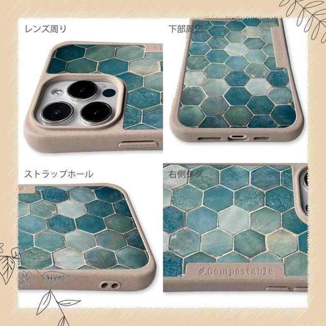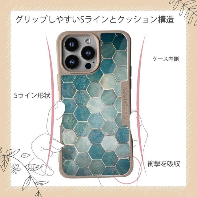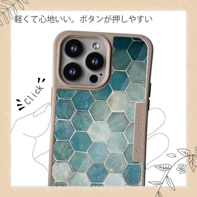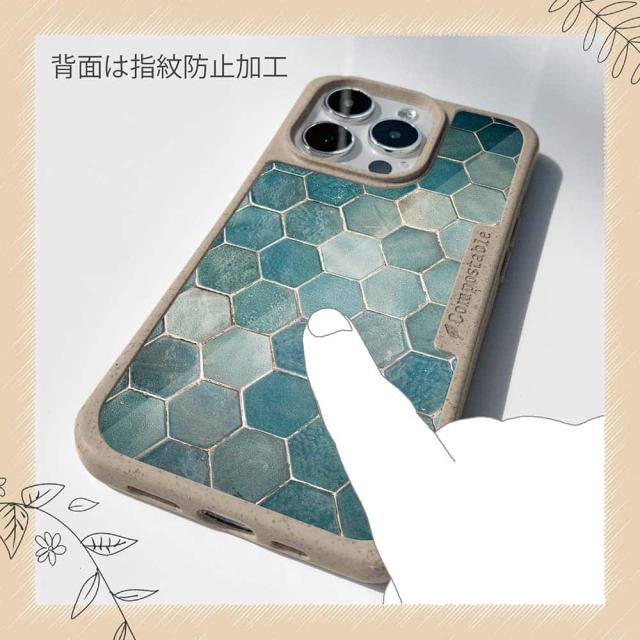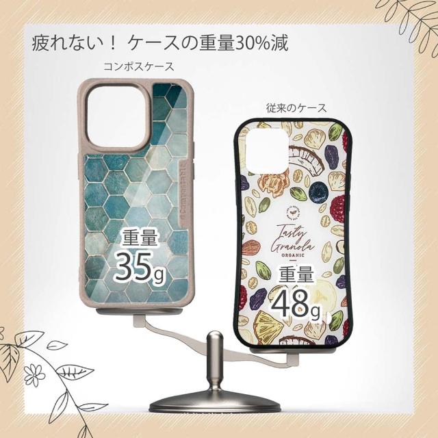 | 注意事項 | コンポスケースは、フレーム部分に「生分解性プラスチック」という環境に優しい素材を使用しております。そのため擦ったり、ぶつけたりする衝撃を与えると脆い部分もあります。耐衝撃ケースではないことをご了承ください。 Qi充電やMagSafe充電にも対応していますが、装着していない時に比べると充電速度は落ちます。 |
