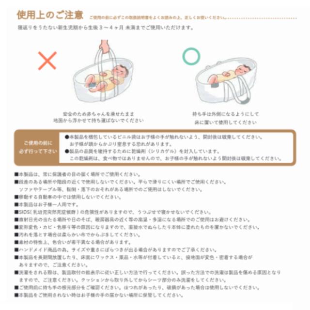 | 注意事項 | ※安全のため赤ちゃんを乗せたまま地面から浮かせて持ち運ばないでください。 ※持ち手は外側になるようにして床に置いて使用してください。 ※ロープ編みのためサイズに多少の誤差が生じます、あらかじめご了承ください。 |