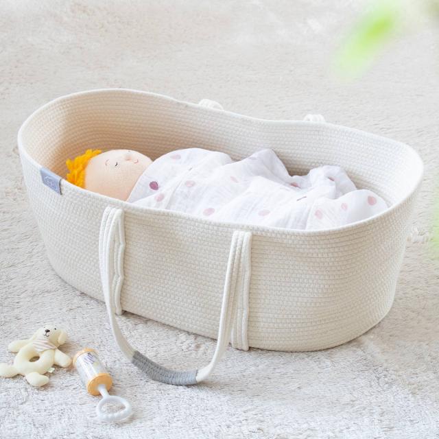 柔らかい肌触りのロープ編みなので、カゴタイプのクーハンと比べて、赤ちゃんの手足が当たっても傷つかず、タオルケットやおくるみなどの布製品を入れても引っ掛かる心配がなく安心です。