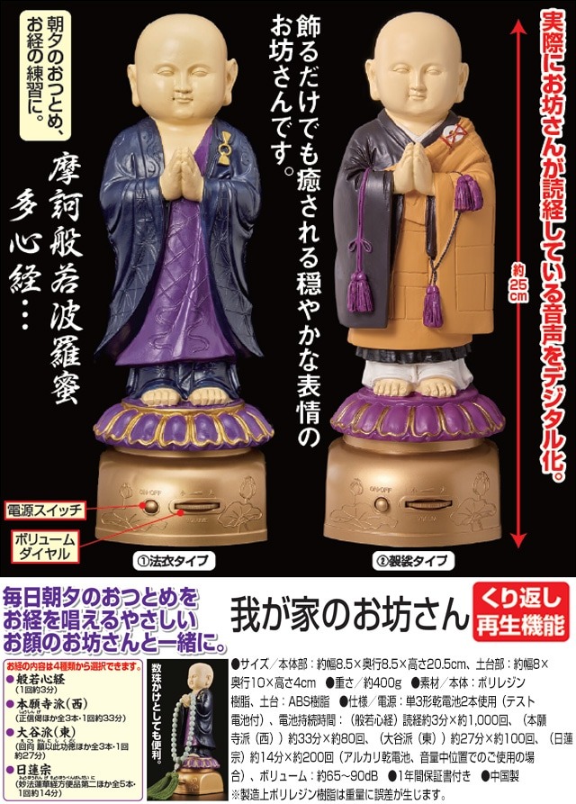 厳かに読経する、我が家のお坊さん。土台のスイッチをONにすると、お坊さんの読経音声が流れます。朝夕のおつとめ、般若心経の練習にもぴったり。日々のおつとめをお坊さんと一緒に。選べる4種類の読経音声、般若心経 、本願寺派(西)、大谷派(東)、日蓮宗が選べます。繰り返し再生機能付き。