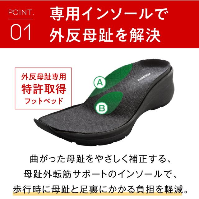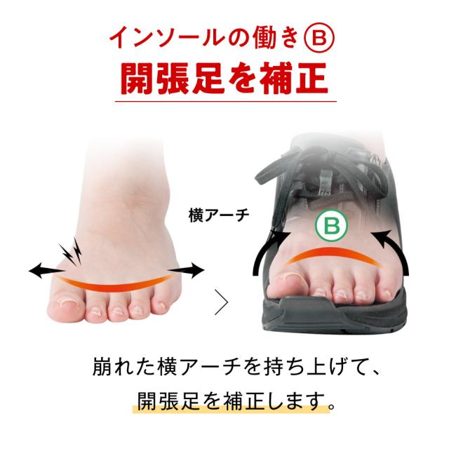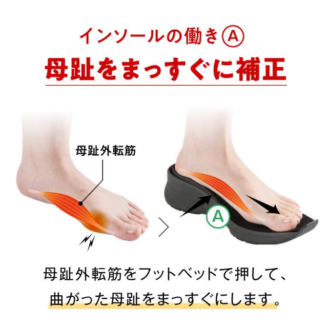 曲がった母趾をやさしく補正する、母趾外転筋サポートのインソールで、歩行時に母趾と足裏にかかる負担を軽減します。
