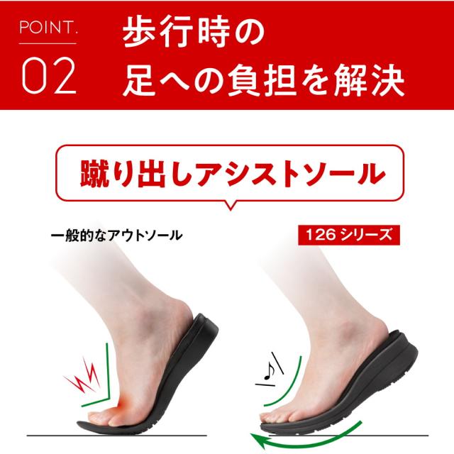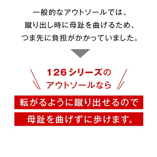 126シリーズのアウトソールなら、転がるように蹴り出せるので母趾を曲げずに歩けます。