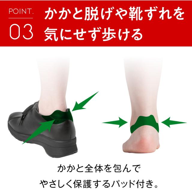 かかと全体を包んでやさしく保護するパッド付き。かかと脱げや靴ずれを気にせずに歩けます。