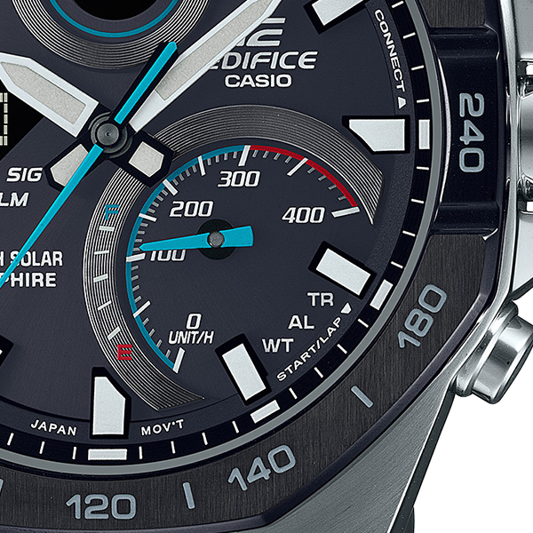 針の指針に加え、液晶で各種情報をわかりやすく表示する多機能モデルです。レーシングチームのガレージで様々な工具から着想を得て、八角形のベゼルを採用しました。Bluetooth®でのモバイルリンク機能により時刻を自動補正する他、ワールドタイムの都市選択など各種機能をスマートフォンアプリから簡単操作。4時側の大きなインダイアルはスピードインジケーターです。距離を設定し、ラップタイムを計測すると平均速度を表示します。また、腕を傾けるだけで文字板、液晶表示を照らすフルオートLEDライトや、太陽や蛍光灯の光で駆動するタフソーラーを搭載しています。