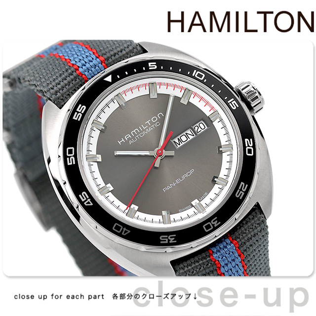 3年保証キャンペーン ハミルトン アメリカン クラシック スイス製 自動巻き メンズ 腕時計 H35415982 HAMILTON AMERICAN CLASSIC PAN EUROP DAY DATE アナログ グレー ◆HAMILTON(ハミルトン)はアメリカ発祥の老舗ブランドです。創業翌年に誕生した懐中時計「ブロードウェイ・リミテッド」は、他の時計よりも正確に時を刻むことから鉄道用時計として採用されました。その後も航空用時計や軍用時計として採用されるなど、品質の高さと流行にながされない独自のデザインが世界中の人々に支持されています。 パン ユーロという名を冠しながらも、ハミルトンのルーツであるアメリカンスピリットが息づくクラシカルな佇まい。現代的なスタイルに80時間の標準持続時間を備えた自動巻きムーブメントは止まることなく歩み続けます。視認性の高いデイデイト表示も兼ね備え、落ち着きがありクラシカルなデザインです。 機械式腕時計
