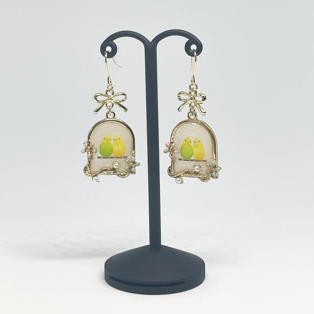 UVレジン ハンドメイドピアス ゴールドフレーム 鳥かごのインコ なかよしVer.(イヤリング変更可)